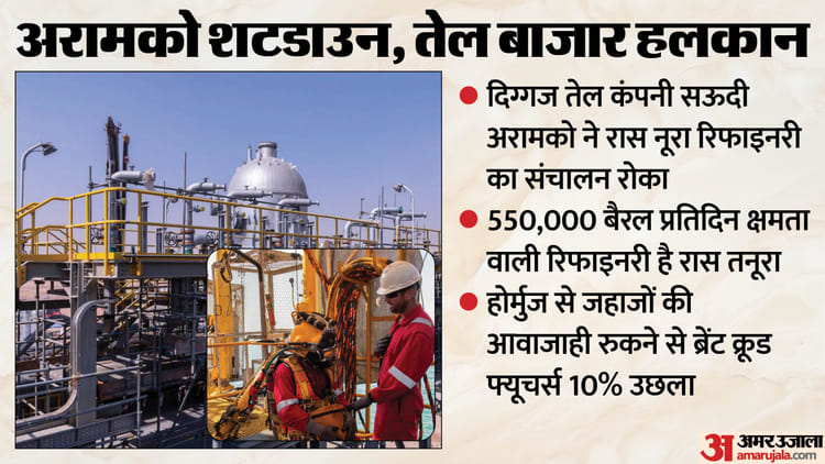ईरान द्वारा किए गए ड्रोन हमलों के बाद सऊदी अरब की दिग्गज तेल कंपनी ‘सऊदी अरामको’ ने अपनी ‘रास तनूरा’ रिफाइनरी का संचालन एहतियातन रोक दिया है। 550,000 बैरल प्रतिदिन की क्षमता वाली यह रिफाइनरी मिडिल ईस्ट की सबसे बड़ी रिफाइनरियों में से एक है और सऊदी क्रूड के लिए एक महत्वपूर्ण निर्यात टर्मिनल है। इन हमलों और ‘होर्मुज जलडमरूमध्य’ में जहाजों की आवाजाही रुकने के कारण सोमवार को ब्रेंट क्रूड फ्यूचर्स में करीब 10% का भारी उछाल दर्ज किया गया।