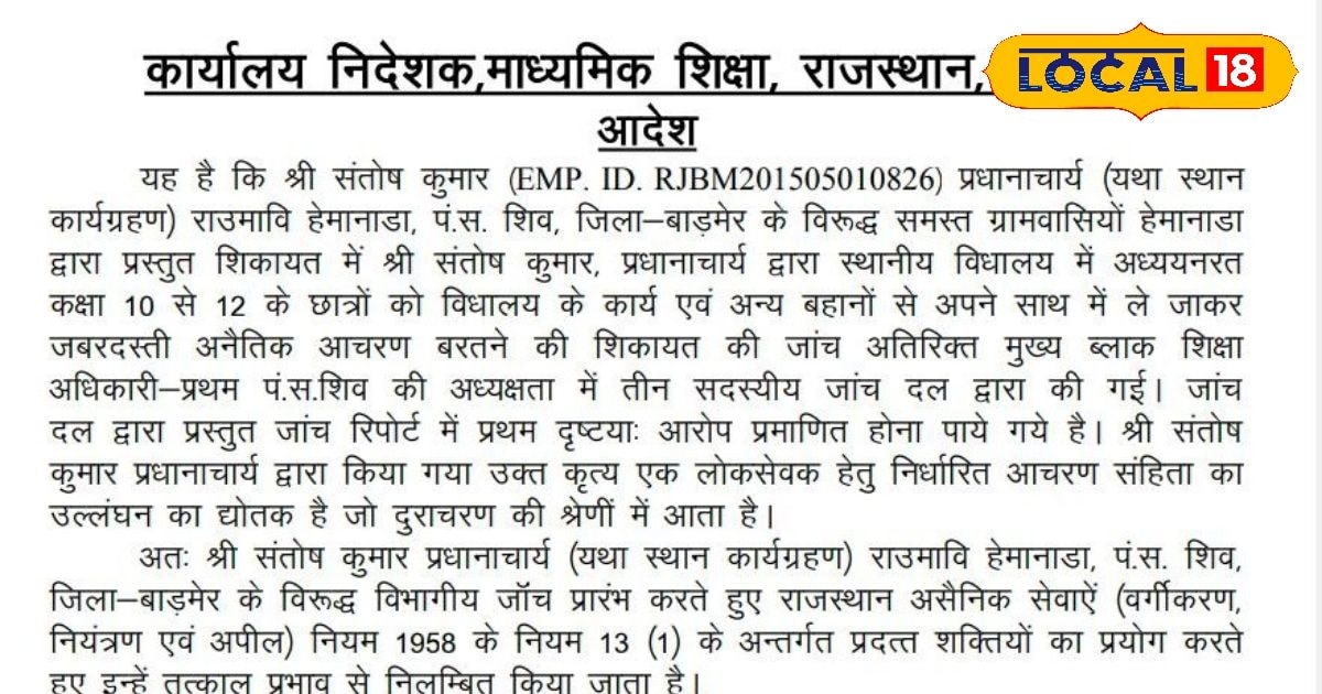 Barmer School Principal Accused of Misconduct with Students: बाड़मेर जिले के राउमावि हेमानाडा स्कूल में शिक्षा के मंदिर को कलंकित करने वाला मामला सामने आया है. यहाँ के प्रिंसिपल संतोष नामा पर स्कूली छात्रों को काम के बहाने बाहर ले जाकर कुकर्म करने के गंभीर आरोप लगे हैं. आरोपी बच्चों को परीक्षा में फेल करने की धमकी देकर उनका शारीरिक शोषण करता था. ग्रामीणों की शिकायत पर जिला कलेक्टर टीना डाबी ने जांच कमेटी बिठाई, जिसमें आरोपों की पुष्टि हुई. माध्यमिक शिक्षा निदेशालय बीकानेर ने तुरंत कार्यवाही करते हुए प्रिंसिपल को निलंबित कर दिया है और उसका मुख्यालय करौली शिफ्ट कर दिया गया है. इस घटना से पूरे बाड़मेर में रोष है और ग्रामीण आरोपी की गिरफ्तारी की मांग कर रहे हैं. शिक्षा विभाग ने आरोपी के खिलाफ सख्त विभागीय जांच भी शुरू कर दी है.
