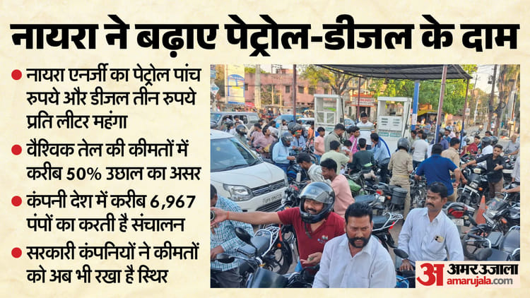 सूत्रों के अनुसार, रूस की रोसनेफ्ट के स्वामित्व वाली नायरा ने पेट्रोल की कीमत में पांच रुपये प्रति लीटर और डीजल की कीमत में तीन रुपये प्रति लीटर की वृद्धि की है, लेकिन प्रभावी वृद्धि दर राज्यों के अनुसार अलग-अलग है, जो वैट जैसे स्थानीय करों पर निर्भर करती है। कुछ स्थानों पर पेट्रोल की कीमत में 5.30 रुपये प्रति लीटर तक की वृद्धि हुई है।