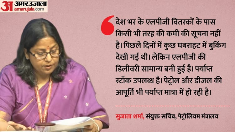 संयुक्त सचिव सुजाता शर्मा ने बताया कि मौजूदा भू-राजनीतिक स्थिति के कारण एलपीजी की आपूर्ति प्रभावित हुई है। हालांकि, बड़ी संख्या में कार्गो लाइन में लगे हुए हैं। देश भर के एलपीजी वितरकों के पास किसी भी तरह की कमी की सूचना नहीं मिली है। उन्होंने यह भी बताया कि पिछले दिनों कुछ घबराहट में बुकिंग देखी गई थी। लेकिन एलपीजी की डिलीवरी सामान्य बनी हुई है। मंत्रालय ने आश्वस्त किया है कि पर्याप्त स्टॉक उपलब्ध है। पेट्रोल और डीजल की आपूर्ति भी पर्याप्त मात्रा में हो रही है। सभी घरेलू उपभोक्ताओं को एलपीजी सिलेंडर नियमित रूप से दिए जा रहे हैं। घरेलू उपभोक्ताओं के लिए पीएनजी की आपूर्ति शत प्रतिशत सुनिश्चित की गई है।