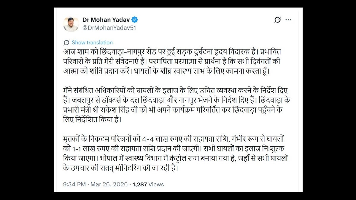 मध्य प्रदेश के मुख्यमंत्री ने छिंदवाड़ा-नागपुर सड़क दुर्घटना पर दुख व्यक्त किया, ऑन-साइट दौरे का आदेश दिया और अधिकारियों को सभी पीड़ितों के लिए मुफ्त इलाज सुनिश्चित करने का निर्देश दिया। मृतकों के परिवारों और गंभीर रूप से घायलों के लिए वित्तीय सहायता की घोषणा की गई, जिसमें राहत प्रयासों की निगरानी के लिए एक समर्पित नियंत्रण कक्ष स्थापित किया गया।